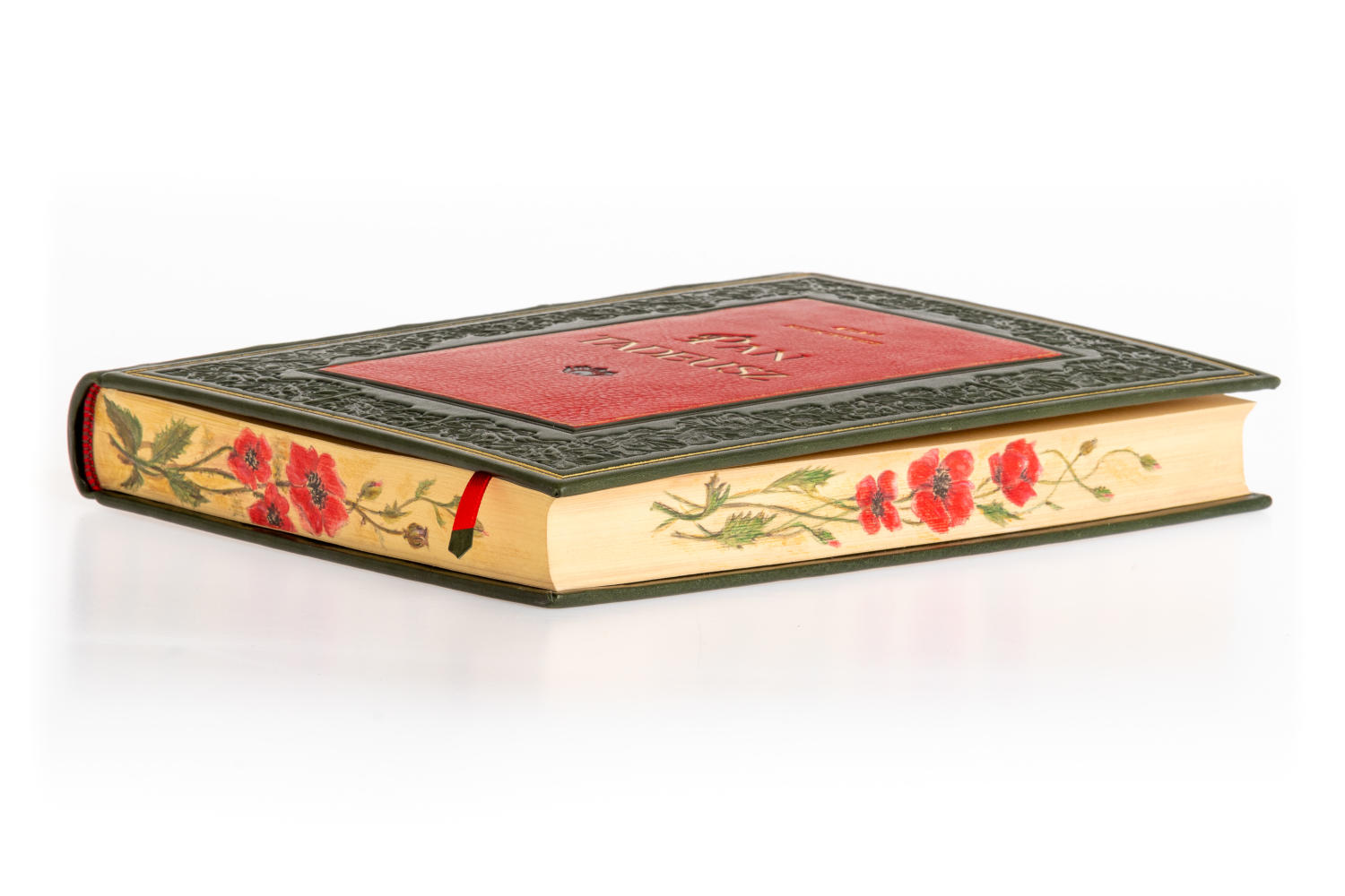 Egzemplarz oprawiony w głęboko tłoczoną skórę. Brzeg książki malowany w motyw z kwiatami maku.