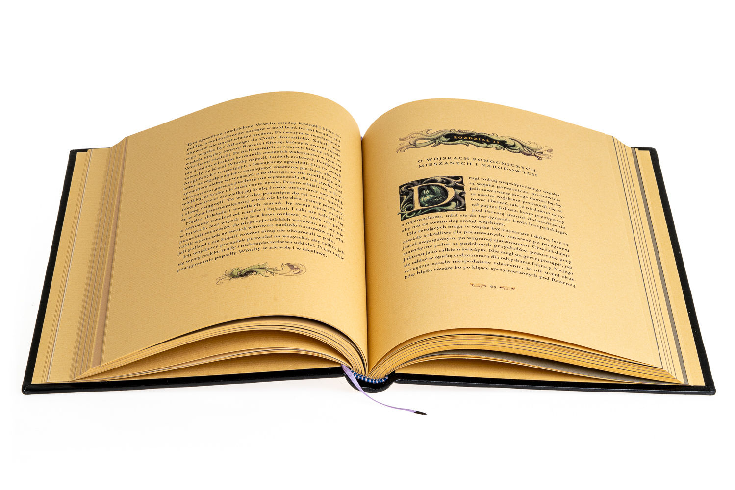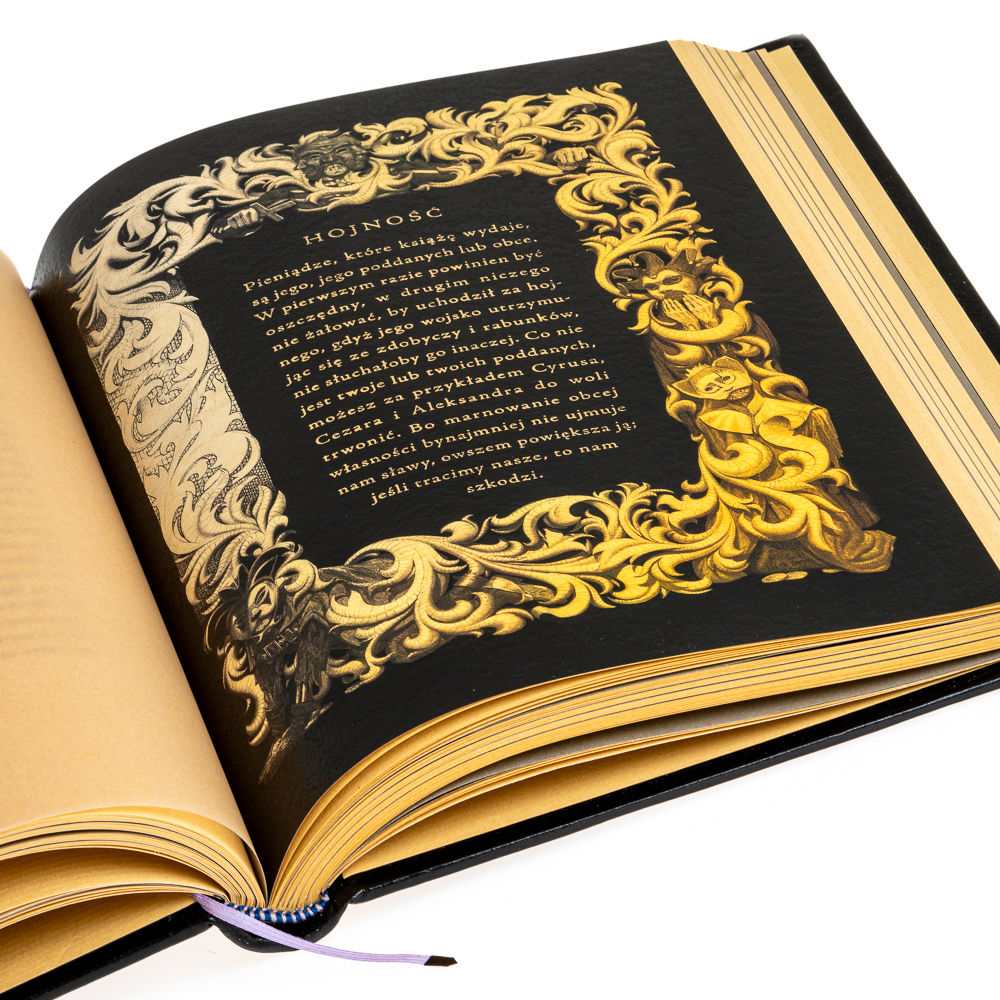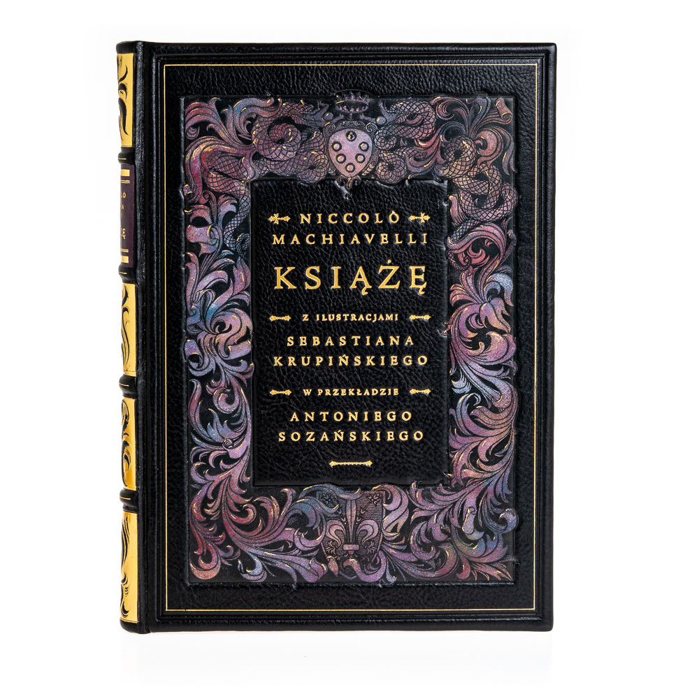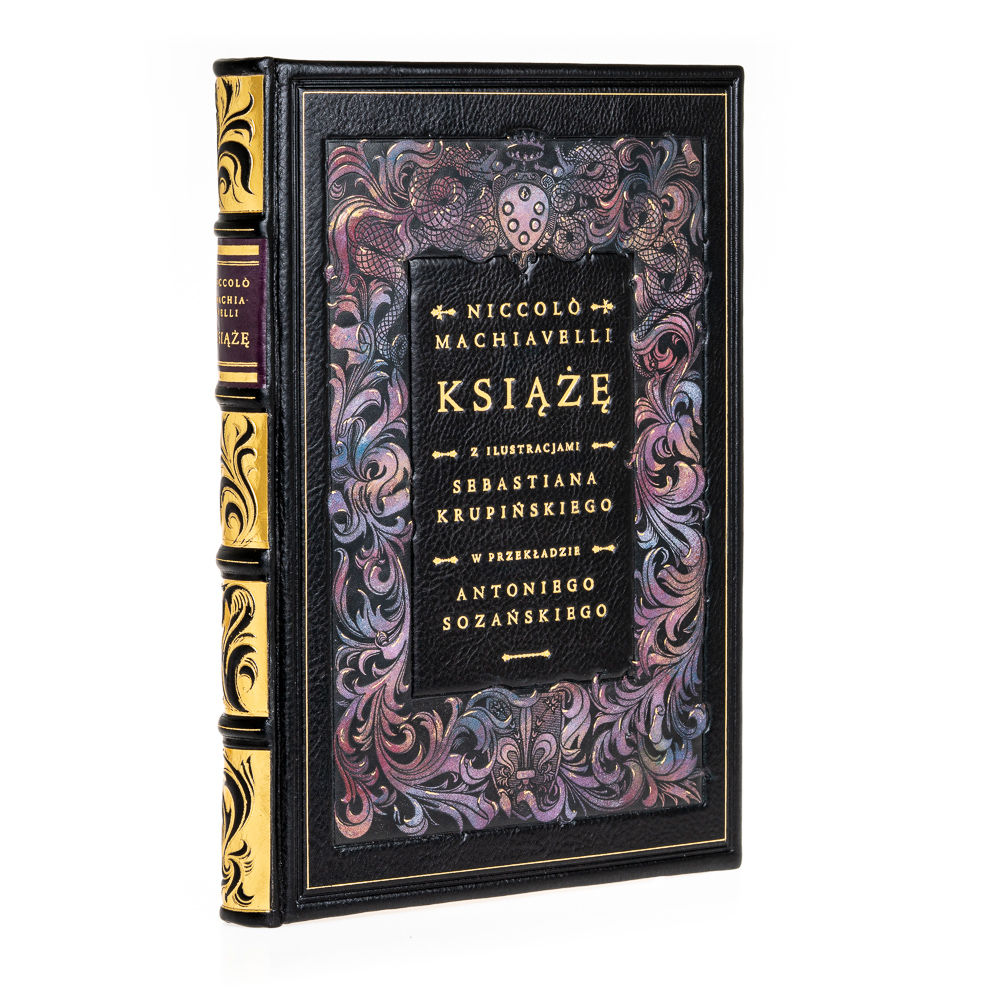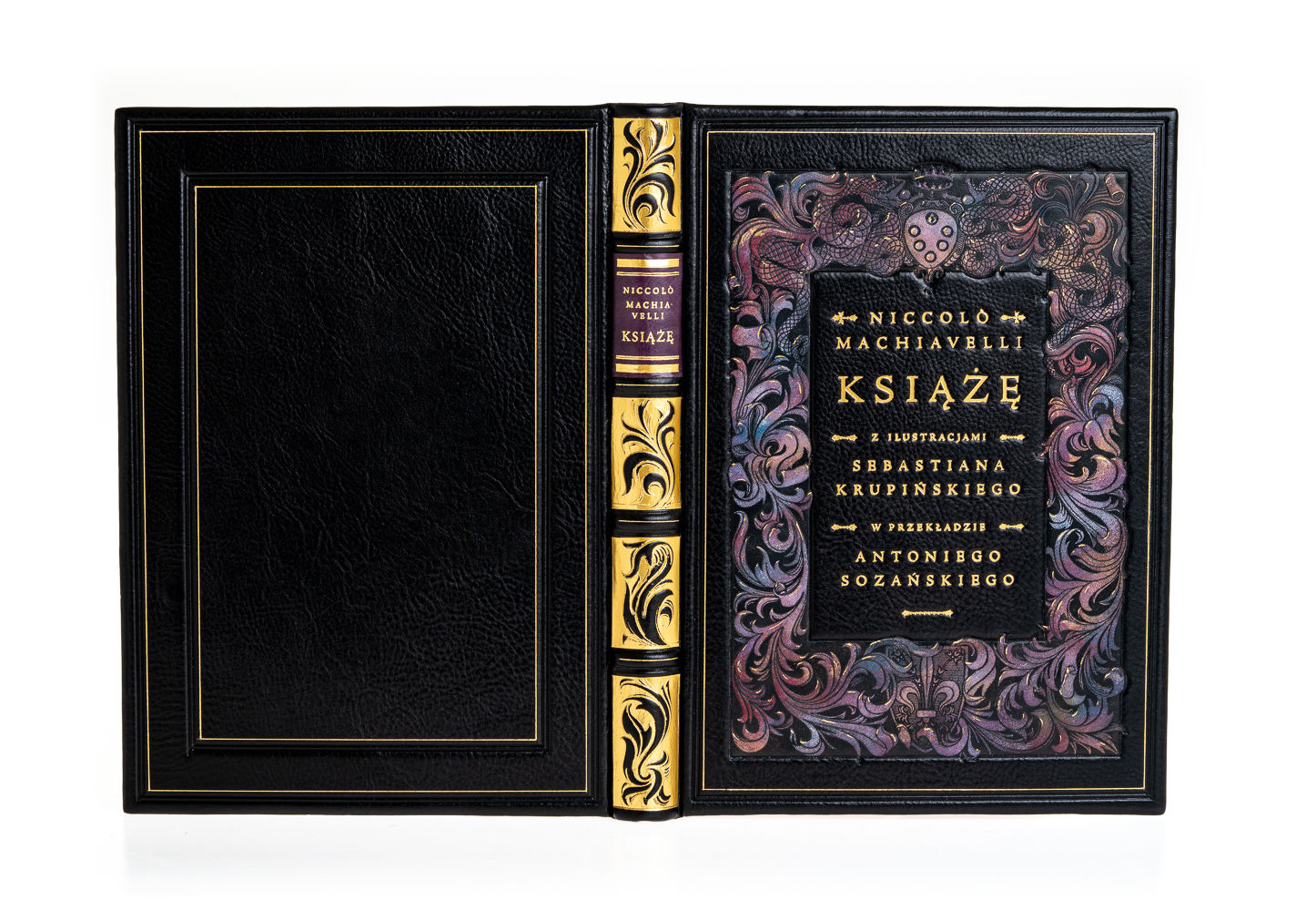 Nasze, bibliofilskie wydanie Księcia zostało wydrukowane na włoskim, artystycznym papierze żeberkowanym. Część tekstu została odbita typograficznie złotą folią. Ilustracje, inicjały tekstu oraz dekoracje wykonał Sebastian Krupiński. Przepiękna oprawa skórzana jest ozdobiona barwioną intarsją, powielającą motywy graficzne z ilustracji i bogatymi, złotymi tłoczeniami. Duży format (ok. 23 x 32 cm) sprawia, że jest to wspaniały obiekt, niezwykła dekoracja, przyciągający wzrok szlachetny przedmiot, ale także niezwykła księga do obcowania z nią i niezwykłego doświadczenia lektury.