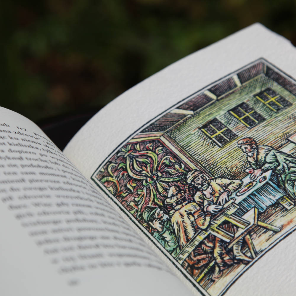 Książka wydrukowana została na papierze artystycznym, kompozycji dopełniają ryciny naśladujące technikę drzeworytu autorstwa Jerzego Kozimora, reprodukowane na papierze ręcznie czerpanym. Oprawiona w oprawę skórzaną z pełnoformatowymi tłoczeniami oraz złoceniami.